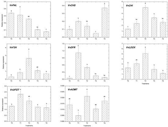 The product naringenin chalcone of chalcone synthase (CHS) can be used to synthesize anthocyanins, proanthocyanidins, and other phenolic compounds [34]. Delgado et al. [21] reported that the tannin content of the berry skin decreased initially after veraison, then increased around the 28th day after veraison and reached the maximum amount a few days before ripening. In this study, the VvCHS relative expression of T4 treatment was significantly higher than other treatments. This is probably related to the berry growth stage of T4 treatment occuring a few days before ripening, which needed higher VvCHS expression to provoke higher amount of tannin. The difference of VvCHS relative expression of T0, T1, and T3 treatments was not significant compared to T2 treatment.