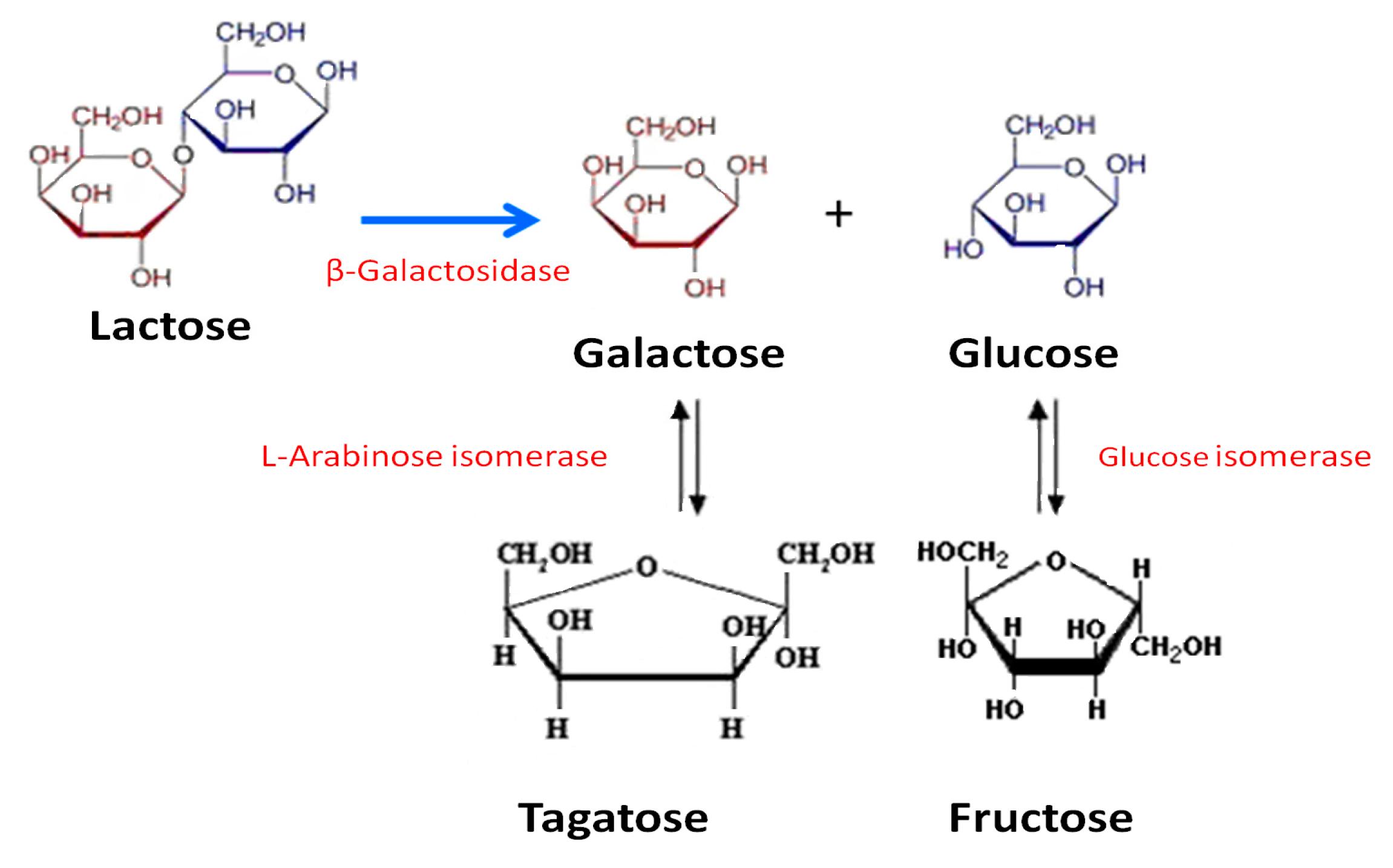 In this work, we have explored the combined use of β-galactosidase biocatalysts developed previously [16], with immobilized d-xylose (d-glucose) and l-arabinose (d-galactose) isomerases to achieve the partial biotransformation of lactose into the ketohexoses d-fructose and d-tagatose (Figure 1).