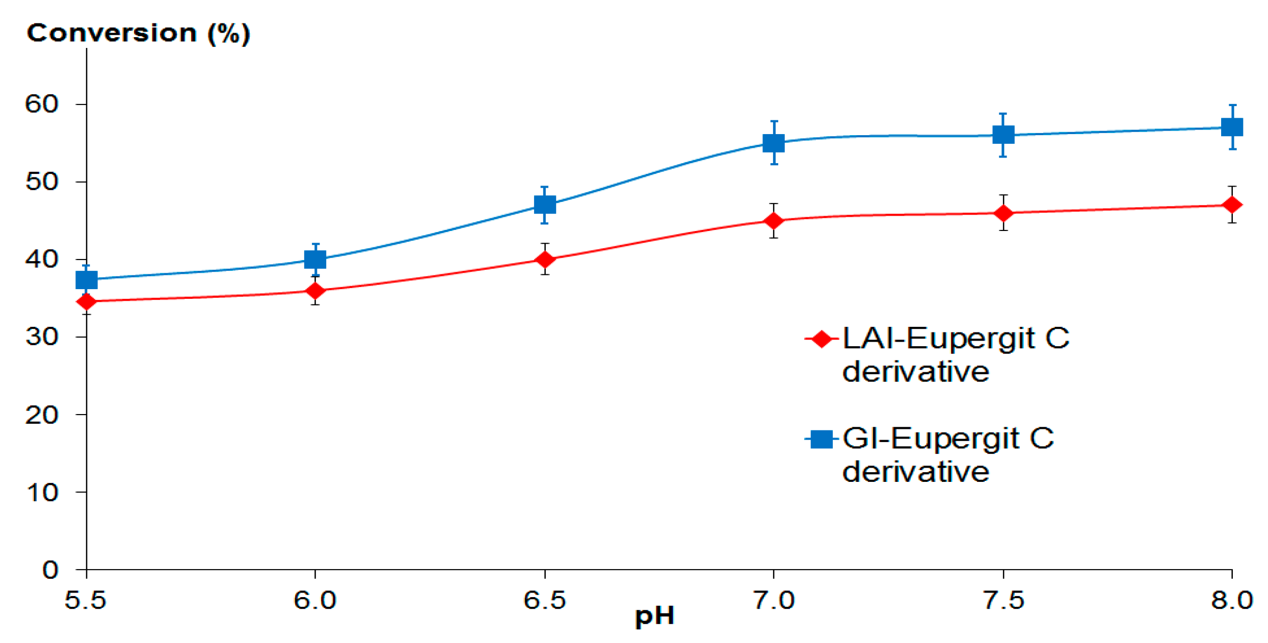 Eupergit C and Eupergit C 250 L derivatives of l-arabinose isomerase and d-xylose isomerase were used for batch isomerization of d-galactose or d-glucose (100 g/L), respectively, in 0.1 M phosphate buffer at temperatures in the range 30–60 °C and pH from 5.5 to 8.0. For l-arabinose isomerase derivatives, conversion percentages achieved at pH 7.0 were 26% at 30 °C and 45% at 60 °C. In the case of d-xylose isomerase derivatives, conversion percentages at neutral pH were higher, attaining 36% of conversion at 30 °C and 55% at 60 °C, respectively, similar to results reported in earlier studies [36]. Figure 4 shows the influence of operational pH on the degree of conversion obtained at 60 °C for l-arabinose and d-xylose isomerases immobilized onto Eupergit C. Conversions in the pH range studied (5.5–8.0) were above 35% in all cases, with best performances at pH 7.0–8.0.