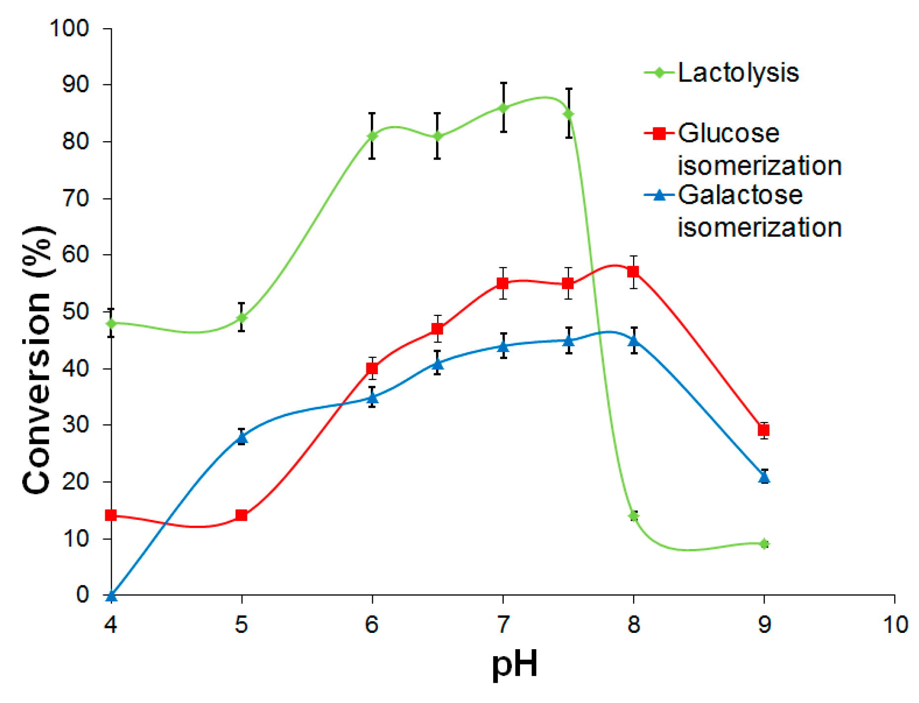 The influence of pH was studied by performing the lactose hydrolysis and isomerization processes at different pHs in the range 4–9 (Figure 5) and analyzing the results in terms of degree of lactolysis and the corresponding percentages of d-fructose and d-tagatose produced under these conditions at 60 °C.