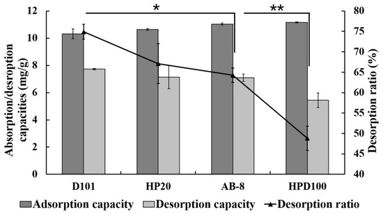 Figure 2. Adsorption and desorption capacities as well as desorption ratios of Hou on different MRs. Desorption ratios was evaluated statistically, * p < 0.05, ** p < 0.01 compared to D101.