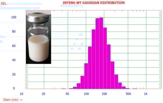 To further improve the safety and activities of HEO, HME (pure HEO: 2 mg/mL) was prepared and characterized. As shown in Figure 6, the prepared HME was a white milky liquid with a uniform appearance and no floating oil. The average particle size (Figure 6) and polydispersity index (PI) of HME were 179.1 nm and 0.126, respectively. HME had a high negative zeta potential of −37.51 mV with a high encapsulation rate of 94.7%. These results indicated that pure HEO was successfully encapsulated into ME and HME had excellent potential for industrial-scale production.