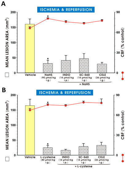 Figure 3 shows that co-administration of NaHS (90 μmol/kg i.g.) or l-cysteine (80 μmol/kg i.g.) with 1) non-selective COX inhibitor, indomethacin (14 μmol/kg i.p.), 2) selective COX-1 inhibitor, SC-560 (14 μmol/kg i.g.) or 3) selective COX-2 inhibitor, celecoxib (26 μmol/kg i.g.) (Figure 3A,B, respectively) remained without a significant influence on the NaHS- and l-cysteine-induced decrease in the area of I/R-induced gastric lesions and the accompanying increase in the GBF as compared with the vehicle-pretreated control group (p < 0.05).