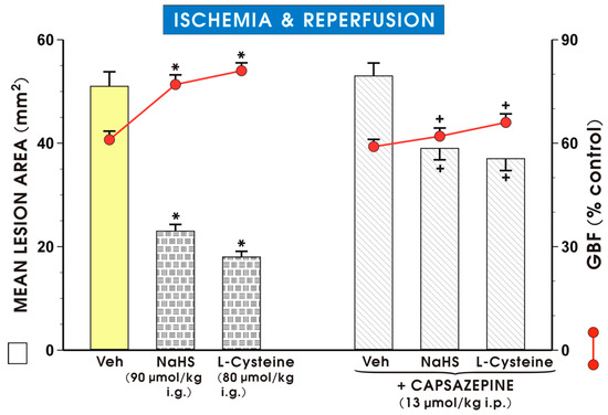 Pretreatment with capsazepine (13 μmol/kg i.p.) which did not significantly increase the area of I/R-induced gastric damage and failed to significantly affect GBF, significantly increased the area of I/R-induced gastric lesions and significantly decreased the GBF evoked by NaHS or l-cysteine as compared with the groups treated with this H2S donor or H2S precursor alone (p < 0.05) (Figure 4).