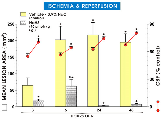 Figure 8 shows that gastric damage area was significantly increased in groups of vehicle-pretreated animals exposed to I followed by 6 h of R as compared with those exposed to I followed by 3 h of R and pretreated with vehicle or NaHS (90 μmol/kg i.g.) (p < 0.05).