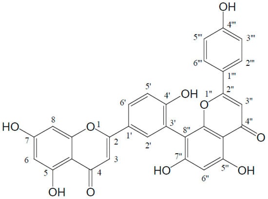 Amentoflavone (C30H18O10) is a common biflavonoid chemically named as 8-[5-(5,7-dihydroxy-4-oxo-4H-chromen-2-yl)-2-hydroxyphenyl]-5,7-dihydroxy-2-(4-hydroxyphenyl)-4H-chromen-4-one, which naturally occurs in many plants. It is also considered as an apigenin dimer linked by a C3′-C8′′ covalent bond (Figure 1). This compound was firstly isolated by Okigawa and his colleagues in 1971 from three plants of the Selaginella species (Selaginella tamariscina (Beauv.) Spring, Selaginella nipponica, and Selaginella pachystachys) [1]. From then on, phytochemical researchers have isolated and identified this biflavonoid from more than 120 plants, some of which have been used as traditional folk medicines in many regions of the world for even thousands of years. With the development of modern pharmacology, more and more evidence has proved many of the bioactivities of amentoflavone, including anti-oxidant [2], anti-inflammatory [3], anti-senescence [4], anti-tumor [5], anti-virus [6], and anti-fungal [7] effects, as well as therapeutic effects on the central nervous system [8] and cardiovascular system [9], etc. With its good pharmacological performance and high content, amentoflavone is even listed as the chemical marker of Selaginellae Herba (“Juanbai” in Chinese, which represents the whole plants of Selagenella tamariscina or Selaginella pulvinata) for quality evaluation in the Chinese Pharmacopoeia [10].