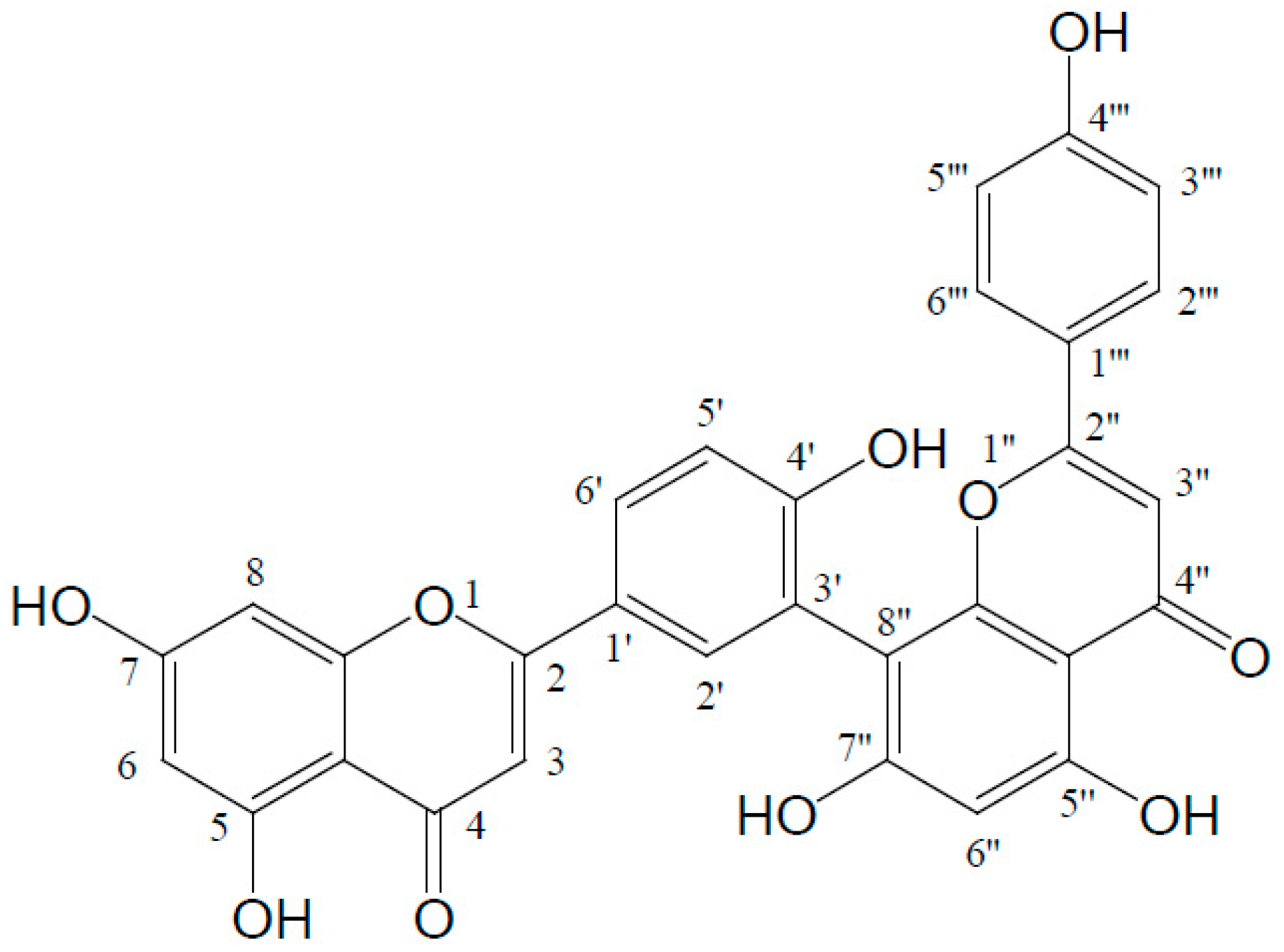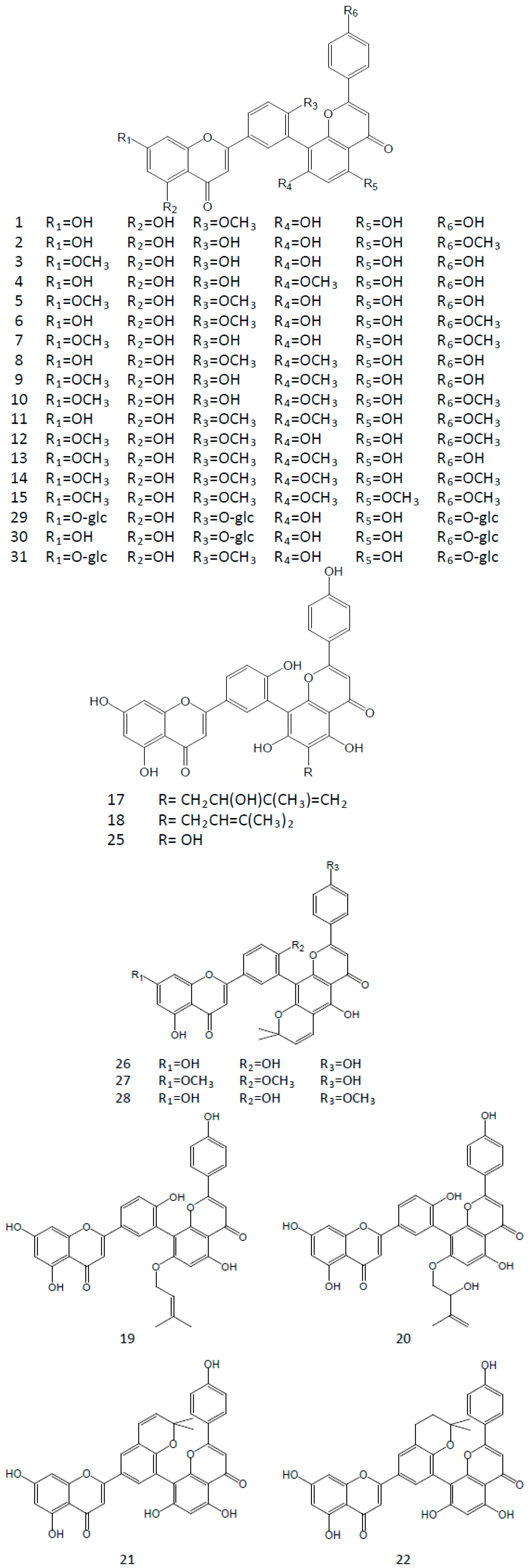 Amentoflavone is considered as a dimer of two apigenins with six hydroxyl groups on the positions of C5, C7, C4′, C5′′, C7′′, and C4′′′ in its structure (Figure 1). Among these groups the C7-, C4′-, C7′′-, or C4′′′-hydroxyl group is easily substituted by a methoxyl group. 7-O-methylamentoflavone (sequoiaflavone), 4′-O-methylamentoflavone (bilobetin), 7′′-O-methylamentoflavone (sotetsuflavone), and 4′′′-O-methylamentoflavone (podocarpusflavone A) are the natural derivatives with a single methoxyl group. There are five derivatives with two methoxyl groups isolated in the plants, i.e., 7,4′′′-di-O-methylamentoflavone (podocarpusflavone B), 4′,4′′′-di-O-methylamentoflavone (isoginkgetin), 7,4′-di-O-methylamentoflavone (ginkgetin), 7,7′′-di-O-methylamentoflavone, and 4′,7′′-tri-O-methylamentoflavone. 7,4′,7′′-tri-O-methylamentoflavone, 7,4′,4′′′-tri-O-methylamentoflavone (sciadopitysin), 7,7′′,4′′′-tri-O-methylamentoflavone (heveaflavone), and 4′,7′′,4′′′-tri-O-methylamentoflavone (kayaflavone) are the derivatives with three methoxyl groups. Furthermore, 7,4′,7′′,4′′′-tetra-O-methylamentoflavone has also been found in some plants. Additionally, there are some other derivatives, such as 6-methy-7,4′-di-O-methylamentoflavone (taiwanhomoflavone A), 6′′-O-hydroxyamentoflavone (sumaflavone), 3′′′-O-methylamentoflavone, 5′-hydroxyamentoflavone, and some glycosides. All of the compounds above and their plant sources are listed in Table 2.