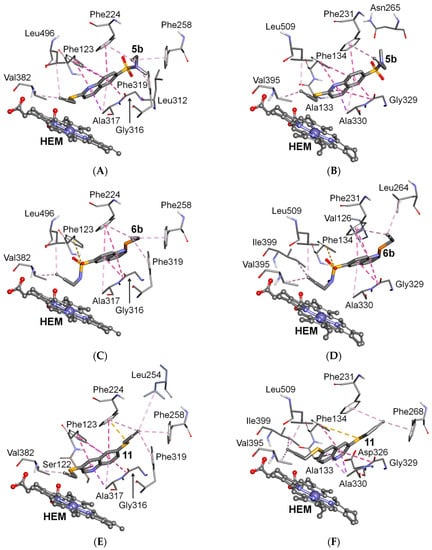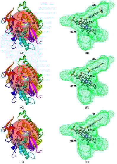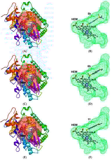 For a detailed analysis of the molecular docking results, three compounds were selected that were docked close to the heme–iron center, and that have a high binding affinity to CYPs and very strong cytotoxic activity: 5b, 6b, and 11 (Figure 1 and Figure 2).