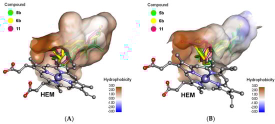 Figure 3. The superposition of compounds 5b, 6b, and 11 inside the active site’s cavity of human CYP1A1 (A) and CYP1B1 (B).