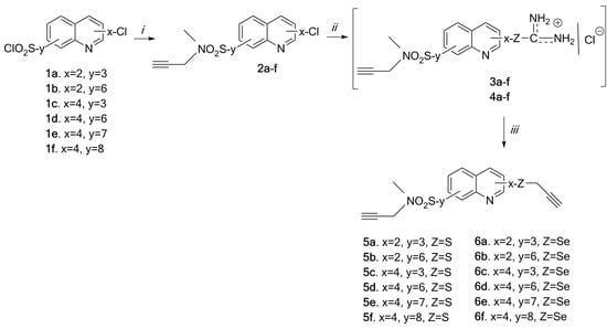 The starting compounds, chloroquinolinesulfonyl chlorides 1af, were obtained from their respective dihalogenoquinolines, as described previously by [32,33]. A high yield of chlro-[N-methyl-N-(propynyl)sulfamoyl]quinolines 2af was produced by amination of chloroquinolinesulfonyl chlorides 1af with N-methylpropargylamine in chloroform with an excess of trethylamine (Scheme 1). Chloro-sulfamoylquinolines 2af were converted into uronium salts 3af and 4af by nucleophilic displacement of the chlorine atom by thiourea or selenourea in ethanol. Hydrolysis of salts 3 and 4 and subsequent S- (or Se-) alkylation of sodium thiolates (or selenoates) with propargyl bromide resulted in the synthesis of compounds 5af and 6af (Scheme 1). The crude products were isolated from aqueous sodium hydroxide by filtration.