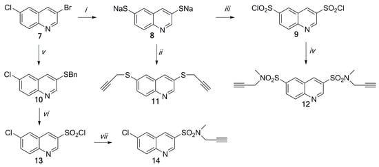 Dipropragylthioquinoline 11 was produced from 3-bromo-6-chloroquinoline 7 in a one-pot process performed with an excess of sodium methanethiolate (12 molar excess) (Scheme 2). This process proceeded stepwise by halogen substitution resulting in 3,6-dimethylthioquinoline (not shown in Scheme 2), which was then S-dealkylated to respective azinedithiolate 8. This can be trapped by alkylation with propargyl bromide to produce dipropargylthioquinoline 11, or oxidtively chlorinated to 3,6-dichlorosulfonylquinoline 9 as described previously [34].