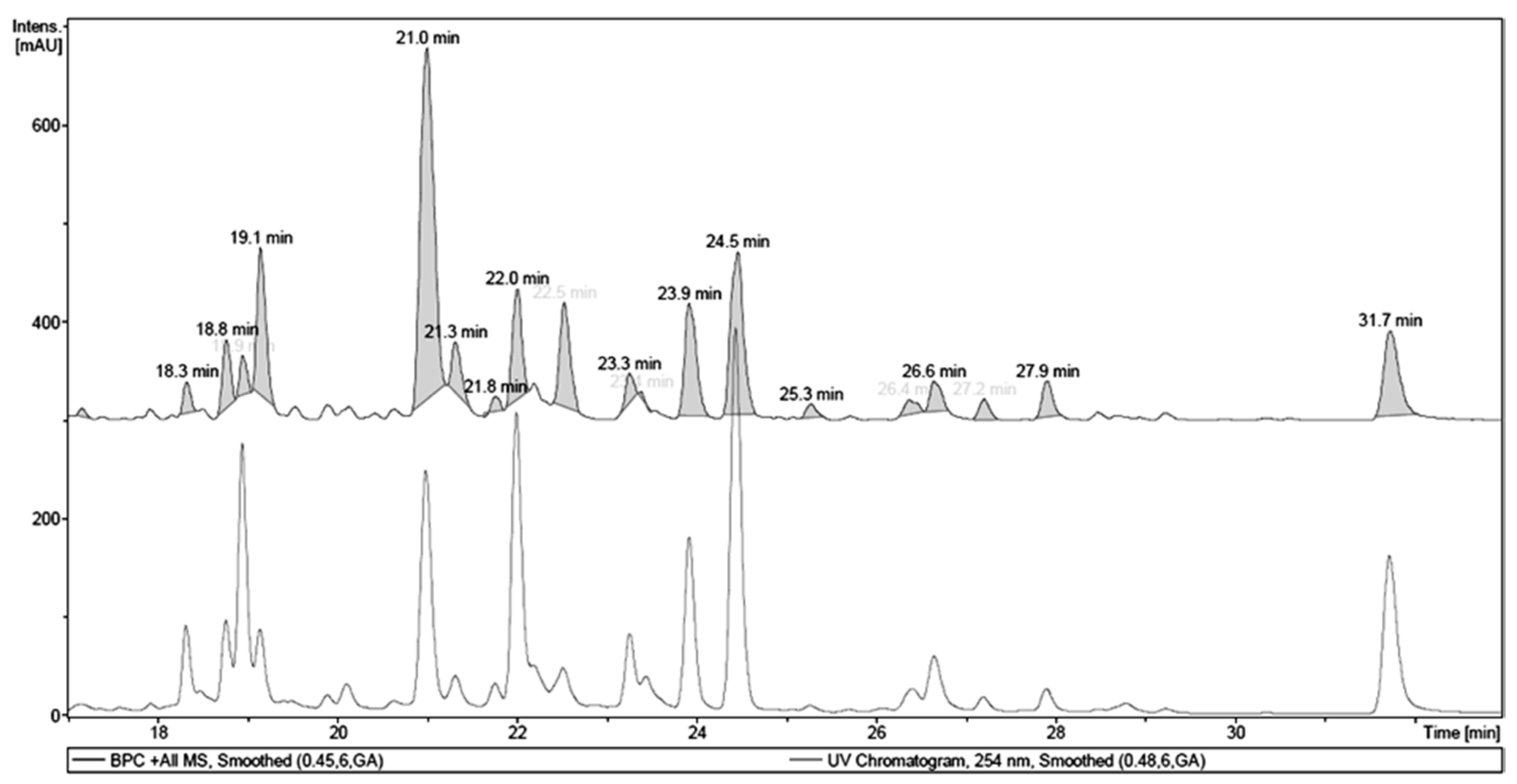 | Retention Time (tR, min) | Identity | Pseudomolecular Ion m/z | Fragment m/z (Loss) | λMAX (nm) |