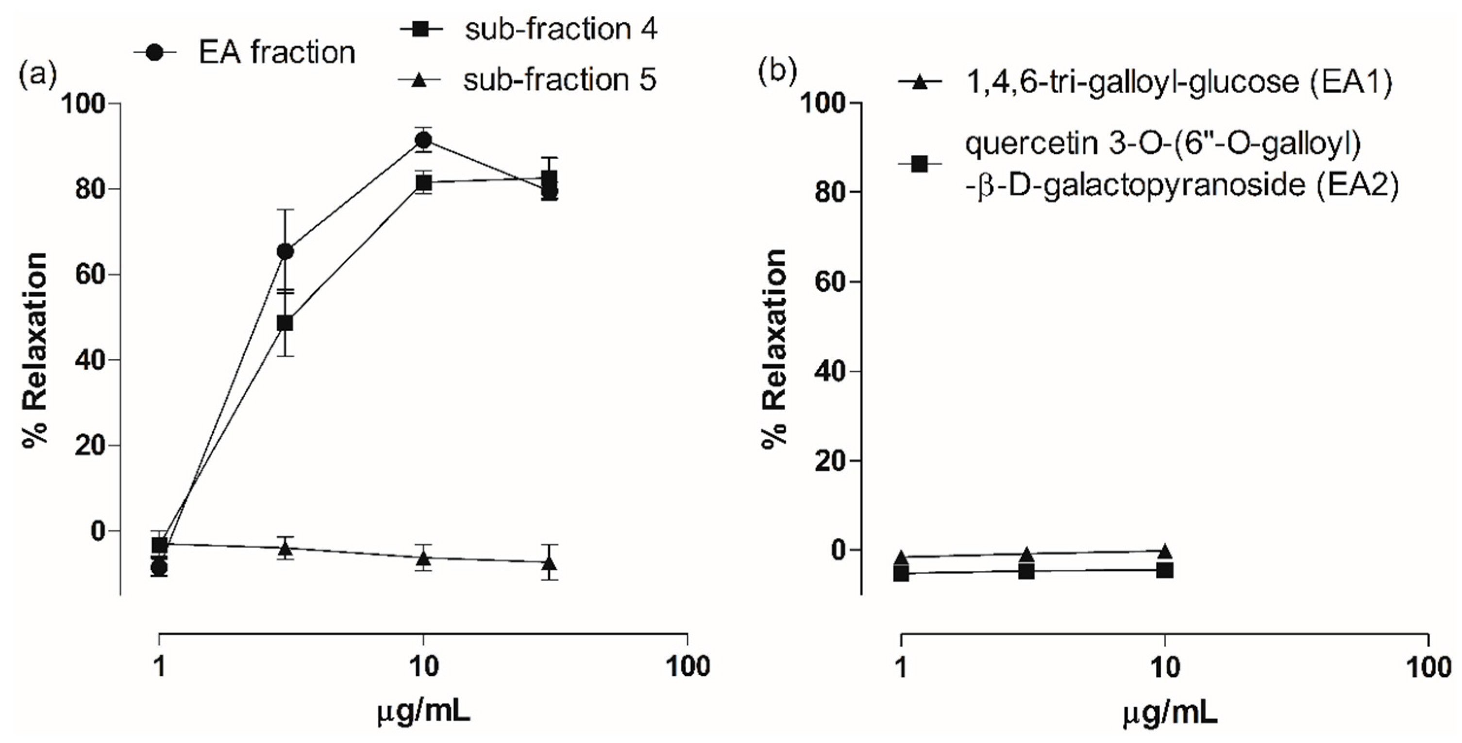 2.3. Vasodilatory Effect of Fractions, Sub-Fractions and Isolated Compounds