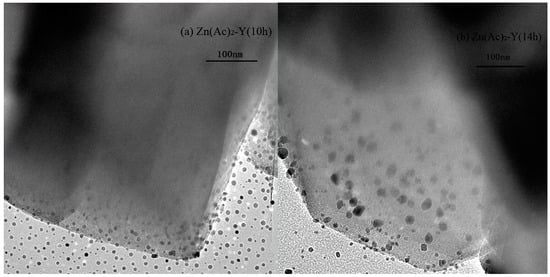 TEM images of adsorbents, (a) Zn(Ac)2-Y (10 h); (b) Zn(Ac)2-Y (14 h).