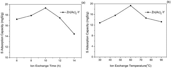 The effect of the ion-exchange temperature on the sulfur adsorption capacity was also studied and the results are shown in Figure 5b. It is shown that the sulfur adsorption capacity apparently increased and then decreased with the increase of the ion-exchange temperature, and reached a maximum (19.32 mgS/g) at 60 °C. The content of Zn2+ increased as the temperature increased. The increase of the ion-exchange temperature promotes the Na+ to get enough energy from the outside to break away from the framework force and form the cation vacancies. Meanwhile, the diffusion rate of Zn2+ is accelerates to enter the framework cation vacancies to compensate for the charge. However, further increasing the temperature from 60 to 90 °C caused the Zn2+ exchange rate to rise too fast, and this may cause pore blockage, which is detrimental to the sulfur adsorption capacity.