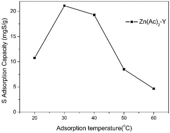 The effect of the adsorption temperature on the sulfur adsorption capacity was investigated in the range of 20 to 60 °C over Zn(Ac)2-Y zeolites (10 h, 60 °C), and the results are presented in Figure 6. It was observed that the sulfur adsorption capacity (21.12 mgS/g) and the sulfur removal (56.01%) apparently increased and then decreased with the increase in the temperature and reached a maximum at 30 °C. The reason may be that increasing the system temperature will greatly increase the diffusion rate of the TP, owing to the decrease in the viscosity of the solution. However, when the temperature is >50 °C, the desorption rate will increase sharply, which causes the sulfur adsorption capacity to decrease [,,].