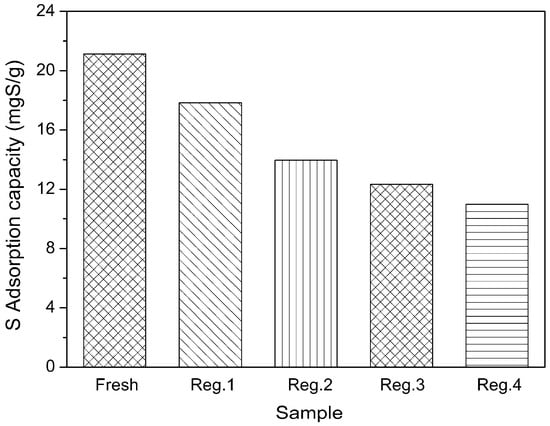 Regeneration performance of Zn(Ac)2-Y by thermal treatment (initial sulfur concentration: 1000 ppmw, t = 2 h, T = 30 °C, adsorbent dosage = 20 g/L; ion-exchange time: 10 h, ion-exchange temperature: 60 °C).