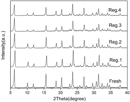 As illustrated in Figure 8, the adsorbent regenerated by the thermal treatment afforded 84.42%, 66.10%, 58.37% and 51.97% of the initial adsorption capacity for the second, third, fourth and fifth adsorption runs. The sulfur adsorption capacity decreased with the increase of the adsorption-regeneration cycle. This could be due to strong interactions of the Zn2+ with the adsorbed TP or, more likely, the low zeolite framework stability of the Zn2+. The X-ray diffraction analysis of regenerated Zn(Ac)2-Y (10 h, 60 °C) is shown in Figure 9 which indicates that parts of the zeolites’ structure experience crystal lattice collapse and lost crystallinity after the calcination processes.