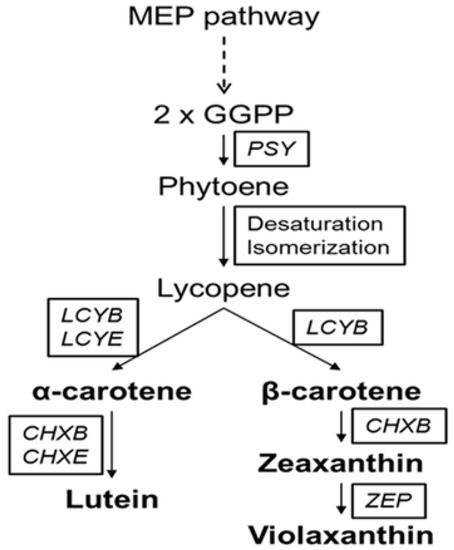 Carotenoids are natural pigments that contribute to the characteristic yellow, orange, and reddish colors of plant tissues including leaves, fruits, vegetables, and flowers [1]. They play crucial roles in photosynthesis, photoprotection, development, as stress hormones, and signaling molecules in plants [2]. In addition, these colors serve to attract pollinating and seed dispersal agents [3]. Several carotenoids act as precursors of vitamin A, which is an efficient antioxidant and is important for human nutrition. Owing to this property, consumption of carotenoid-rich food is considered to offer protection against some cancers, UV-induced skin damage, coronary heart disease, cataracts, and molecular degeneration [4]. Furthermore, carotenoids are commercially utilized in the agricultural, food, pharmaceutical, and cosmetic industries [5]. The carotenoid biosynthetic pathway has been well characterized on the basis of previous reports on various organisms [6]. In plants, carotenoids are synthesized by nuclear-encoded enzymes in plastid membranes [7]. The pathway begins with condensation of two molecules of geranylgeranyl diphosphate (GGPP), derived from the upstream methylerythritol (MEP) pathway, to form the C40 phytoene (Figure 1), in a step mediated by phytoene synthase (PSY) [2]. Phytoene is then converted into lycopene by continuous modification, which includes poly-cis desaturation and isomerization [8]. Subsequently, cyclization of lycopene leads to the synthesis of various carotenes [5]. α-Carotene is produced from lycopene via the combined action of lycopene β-cyclase (LCYB) and lycopene ε-cyclase (LCYE). Lycopene can also be converted to β-carotene by LCYB. α-Carotene and β-carotene are hydroxylated to lutein and zeaxanthin by β-ring hydroxylase (CHXB) and α-ring hydroxylase (CHXE), respectively. Violaxanthin is catalyzed by zeaxanthin epoxidase (ZEP). Most of the β-carotene in Nature occurs as the trans form, although cis form β-carotene also occurs in food [9].