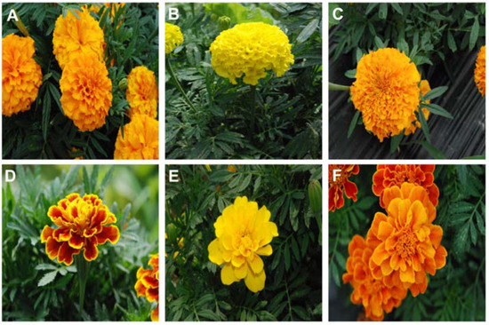 Flowers of different Tagetes cultivars grown in Chungnam National University, South Korea. Photographs were taken by Y.J. Park. (A): Discovery Orange; (B): Inca Yellow; (C): Inca Orange; (D): Durango Bee; (E): Durango Yellow; (F): Safari Red.