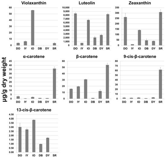 The color of plants tissues can vary from yellow to red to orange, depending on the number of conjugated double bonds and the diverse functional groups in carotenoid molecules [27,28,29]. Carotenes, which are simple carotenoid forms, contain various isomeric structures, including α, β, γ, δ, ε, and ζ [30]. Of these, α- and β-carotenes are the primary forms of carotenes. Xanthophylls, which are the oxidized derivatives of carotenes, are mostly found in the leaf, and impart yellow to red colors [31]. Lutein, zeaxanthin, and cryptoxanthin are the commonly occurring xanthophylls [32] with fruits and vegetables being particularly abundant in lutein [33,34]. In the present study, we monitored the carotenoids in flower extracts from six cultivars of Tagetes using HPLC analysis. In total, seven carotenoids (four types of carotenes: α-carotene, β-carotene, 9-cis-β-carotene, and 13-cis-β-carotene; and three types of xanthophylls: violaxanthin, lutein, and zeaxanthin) were detected in Tagetes (Figure 3).
