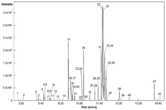 Metabolic profiling provides a global overview of plant metabolic phenotypes [15,16]. In particular, GC-MS has been increasingly applied in metabolomics studies because the capillary columns used in GC enable the separation of more than 100 compounds in a single analysis [38]. Therefore, we used GC-TOFMS to identify and quantify the low-molecular-weight hydrophilic compounds present in Tagetes flowers. In terms of GC-MS data, deconvolution is the process of computationally separating co-eluting components and creating a pure spectrum for each component. Commercial software tools, such as ChromaTOF and AMDIS have been developed for this purpose [38]. In this study, we used ChromaTOF software for peak deconvolution. Peak identification was performed by matching the m/z and retention time values of reference compounds (Figure 4). In total, 42 metabolites-four phenolics (ferulic, p-hydroxybenzoic, syringic, and vanillic acids) and 38 primary metabolites-were detected in marigolds. The corresponding retention times are illustrated in Table S1 and are consistent with our previous data [39].