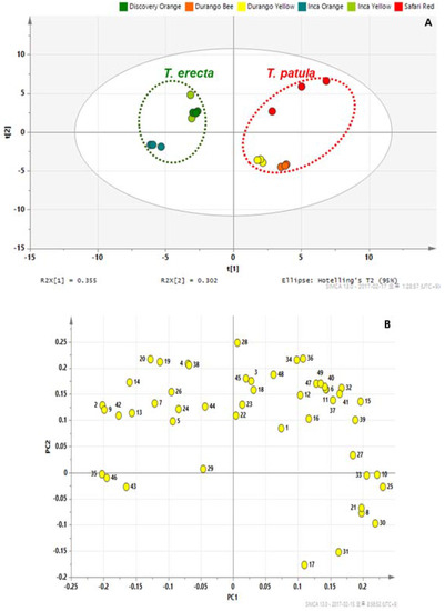 Metabolomics allows the rapid assessment of metabolites and the identification of biomarkers for discrimination of samples based on the genotype and environmental conditions [40]. Quantification data of the 42 identified metabolites, which were normalized based on IS signal intensity, and seven carotenoids were subjected to PCA to identify differences in metabolite profiles among the examined cultivars (Figure 5). The PCA was performed on the 49 metabolites with standardization pre-processing. Core primary metabolites offer a great opportunity to discriminate metabolites between different genotypes [41]. The quality of the PCA models is described by R2 values [42], which are defined as the proportions of variance in the data explained by the model and represent the goodness of fit. R2 values of 0.657 were investigated from the PCA model using two components. The Q2 value for the PCA model was 0.439. With the exception of cultivars IY and DO, separation between cultivars was apparently performed by PCA. Furthermore, principal component 1 (PC1) resolved T. erecta from T. patula.
