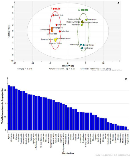 In principal component 2 (PC2), glutamine had a strong impact on the separation. PCA showed that, with the exception of trehalose, all sugars and most carotenoids were clustered on the right side of the loading plot. We found that sugars as well as zeaxanthin and β-carotene were higher in SR than in the other cultivars. To maximize the separation between T. erecta and T. patula, OPLS-DA was applied (Figure 6).