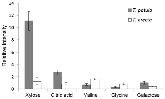 Relative quantification of metabolites that were significantly different (p < 0.0001) between T. patula and T. erecta. Data are represented as the mean ± SD.