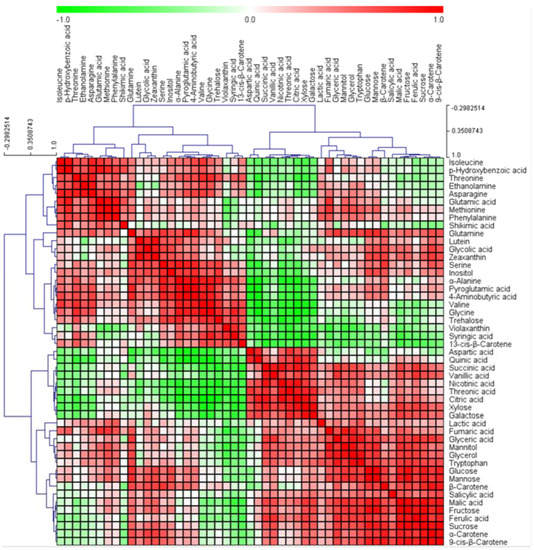 Correlation matrix of 49 metabolites from six cultivars of marigold. Each square indicates r (Pearson’s correlation coefficient values of a pair of compounds). On the basis of the intensity of red and green colors, the value of correlation coefficient is reflected. Hierarchical clusters are represented by a cluster tree.