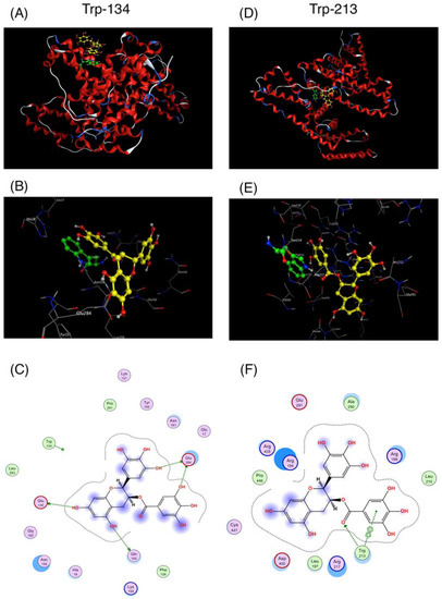 Interaction of epigallocatechin gallate (EGCg) with Trp residues in bovine serum albumin (BSA) by docking simulation. The simulation was carried out using the Docking program of the Molecular Operating Environment (MOE) suite. 3D model of the docking pose of EGCg (yellow) against Trp-134 at the protein surface (A) and against Trp-213 in the drug-binding site I (D) of BSA (red cartoon). Enlarged views of (A,D) are shown in (B,E), respectively. 2D models of (B,E) are shown in (C,F), respectively.