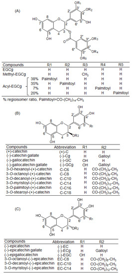 Catechins are natural active compounds contained in foods such as tea, grapes, chocolate, apples, and berries [1]. Catechins possess two benzene rings (the A- and B-rings) and a dihydropyran heterocycle (the C-ring) with a hydroxyl group at the C-3 position. Catechins are classified into cis- and trans-types from the configuration of the two hydrogens at the C-2 and C-3 positions on the C-ring. Gallate-type catechins have a gallate ester at the C-3 position. (−)-Epigallocatechin gallate (EGCg) is the most abundant catechin in tea leaves. Methylated catechins such as epigallocatechin-3-O-methyl gallate are abundant in Benifuuki (Camellia sinensis L.), a tea cultivar [2].