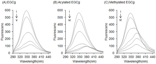 Fluorescence measurements give information about the molecular environment of a chemical interacting with a target protein; specifically, the fluorescence of a protein can be quenched by the interaction between its Trp residues and a ligand [21,22]. Herein, BSA showed a strong fluorescence peak around 345 nm—mainly arising from its Trp residues—when the excitation wavelength was set at 280 nm. The fluorescence quenching of the Trp residues in BSA was measured after treatment with EGCg and its derivatives to estimate their binding affinity against BSA. The structures of the studied compounds are shown in Figure 2. After BSA (0.3 mg/mL) was treated with various concentrations of EGCg (1–25 µM), the fluorescence intensity of the Trp residues decreased in a dose-dependent manner (Figure 3A). The peak wavelength was shifted to the longer side (red-shifted) by EGCg. The fluorescence spectra of another natural catechin was also measured (data not shown). Figure 3B,C show the fluorescence spectra of acylated EGCg and methylated EGCg. These EGCg derivatives quenched the fluorescence of BSA in the same manner as EGCg, with a red shift of the peak wavelength. Neither EGCg nor its derivatives showed any intrinsic fluorescence under our experimental conditions (data not shown).