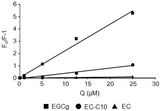 Stern–Volmer plots of catechins and BSA. Representative results for EGCg, EC-C10, and (−)-EC are shown.