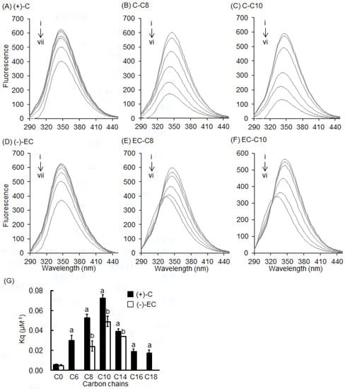 Effects of catechins and 3-O-acyl-catechins on fluorescence of BSA. Fluorescence spectra of 0.3 mg/mL BSA with various concentrations of (A) (+)-C; (B) C-C8; (C) C-C10; (D) (−)-EC; (E) EC-C8; and (F) EC-C10 were measured at an excitation wavelength of 280 nm. Symbols i to vii show the spectra of BSA with increasing quencher concentrations of 0, 1, 5, 12.5, 25, 50, and 100 µM, respectively; (G) Relationship between Kq value and chain length of 3-O-acyl-catechins.