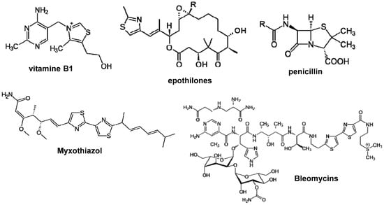 The structures of vitamin B1, the epothilones, penicillins, myxothiazol and bleomycin.