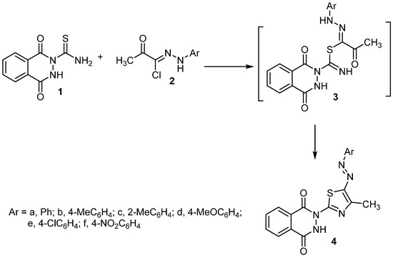 The reaction between 1,4-dioxo-3,4-dihydrophthalazine-2(1H)-carbothioamide (1) and acetyl hydrazonoyl chloride derivatives 2 in ethanol, in the presence of a base catalyst under optimized conditions, yielded only one isolated product (Scheme 1). The spectroscopic information confirmed the formation of products 4, likely produced via intermediates 3 by elimination of a water molecule (Scheme 1). For example, the 1H-NMR spectra of compounds 4a–f, which exhibited singlet signals at δ 2.55–2.60 ppm (CH3) and one D2O exchangeable peak at δ 9.18–10.71 ppm corresponding to the phthalazine-NH.