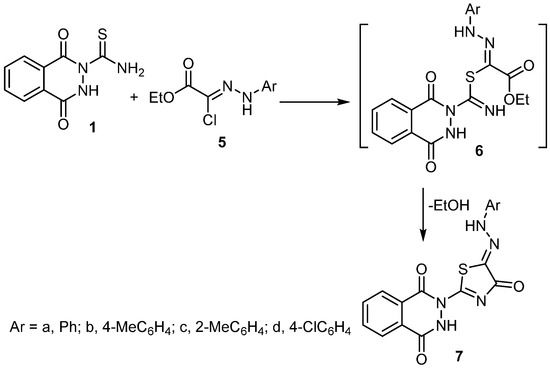 Melting points were measured with an IA 9000-series digital melting-point apparatus (Bibby Sci. Lim. Stone, Staffordshire, UK). IR spectra were recorded in potassium bromide discs on FTIR 8101 PC infrared spectrophotometers (Shimadzu, Tokyo, Japan). NMR spectra were recorded on a Mercury VX-300 NMR spectrometer (Varian, Inc., Karlsruhe, Germany) operating at 300 MHz (1H-NMR) and run in deuterated dimethylsulfoxide (DMSO-d6). Chemical shifts were related to that of the solvent. Mass spectra were recorded on a Shimadzu GCeMS-QP1000 EX mass spectrometer (Tokyo, Japan) at 70 eV. Elemental analyses were measured using an ElementarVario LIII CHNS analyzer (elementar Analysensysteme GmbH, Hanau, Germany). Ultrasonication was carried out in an ElmaRD-7700 apparatus (Singen, Germany). The electric supply was 230 V, A.C. 50 Hz, 1 phase; the ultrasonic frequency was 36 KHz and the ultrasonic power 100 W. 1,4-Dioxo-3,4-dihydrophthalazine-2(1H)-carbothioamide (1) [36] and hydrazonoyl halides 2 and 5 [37] were prepared as previously reported in the respective literature.