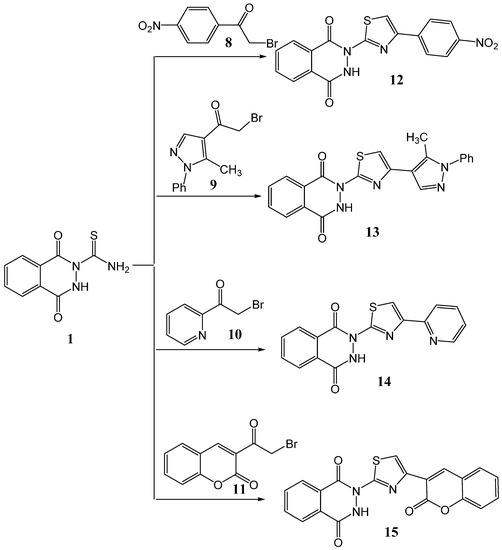 A mixture of 1,4-dioxo-3,4-dihydrophthalazine-2(1H)-carbothioamide (1, 0.221 g, 1 mmol) and α-bromoketones 8–11 (1 mmol) in ethanol (20 mL) was refluxed for 4–6 h (monitored by TLC). The product started to separate out during the course of reaction. The solid product was filtered, washed with water, dried and recrystallized from appropriate solvent to give the corresponding thiazoles 12–15, respectively.
