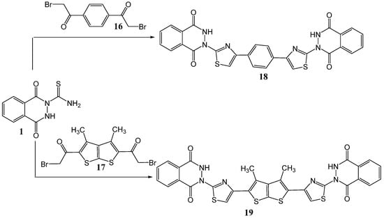 A mixture of 1,4-dioxo-3,4-dihydrophthalazine-2(1H)-carbothioamide (1, 0.221 g, 1 mmol) and bis-α-bromoketones 16 and compound 17 (2 mmol) in ethanol (20 mL) was irradiated by an ultrasonic generator in a water bath at 50 °C for 30–60 min. (irradiation was continued until all of the starting materials have been disappeared and the product was formed, monitored by TLC). The solid that formed after cooling was filtered and recrystallized from DMF to give the corresponding bisthiazoles 18 and 19, respectively.