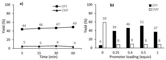 The study of the reaction time was carried out following the general procedure at 140 °C with 0.5 equiv. of Cu(OTf)2. The results shown in Figure 1a indicate that there is no pronounced advantage for both the DFF yield and CMF conversion by running the reaction for more than 5 min. Regarding the promoter loading, it was observed that 0.5 equiv. of Cu(OTf)2 is the optimal amount, yielding the product DFF in 51% yield.