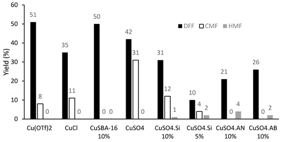 Oxidation of CMF in the presence of different heterogeneous catalysts indicated that CuSBA-16 (10%) is the most efficient promoter, leading to a similar yield of DFF as the homogeneous promoter Cu(OTf)2. Remarkably, CuSO4, which is the cheapest catalyst tested, gave 42% yield of DFF (Figure 4). Using a higher amount of CuSO4 (1%), longer reaction time (up to 30 min), or higher temperature (up to 170 °C) gave lower yields of DFF (38%, 41%, and 35%, respectively), together with the formation of small amounts of HMF (up to 7%, see full results in Table S4).