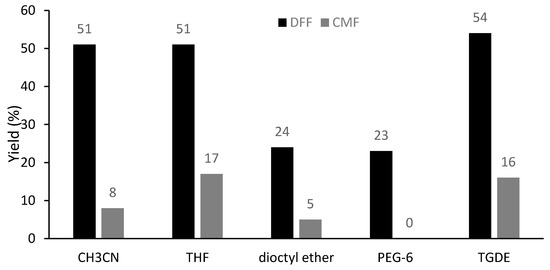 In order to facilitate the flow process, several ethers were tested as solvents for the oxidation of CMF using Cu(OTf)2 as the promoter, including those with high boiling points (b.p. higher than 160 °C) such as dioctyl ether, PEG-6 and triethylene glycol dimethyl ether (TGDE) (Figure 5). Remarkably, TGDE gave a better yield of DFF (54%) than acetonitrile, together with 16% of unreacted CMF. In addition, the oxidation is also feasible using CuSO4 or supported CuSO4 on silica (CuSO4·Si (10%)) in TGDE, yielding DFF in 33% and 44%, respectively (Table S5).