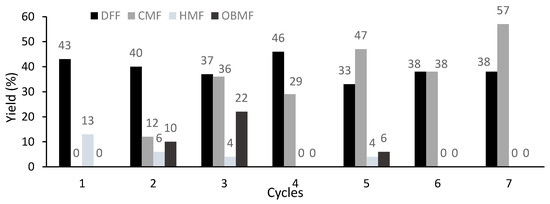 The heterogeneous catalyst CuSO4·Si (10%) was selected to explore catalyst reuse (Figure 6). Remarkably, only a slight erosion of the DFF yield was observed over seven cycles. (1st cycle: 43%; 7th cycle: 38%). In addition, the amount of unreacted CMF increased from cycle to cycle (1st cycle: none; 7th cycle: 57%). Interestingly, for the cycles in which the formation of HMF was observed, formation of the dimer OBMF was also observed, which could arise from the reaction of HMF with CMF.