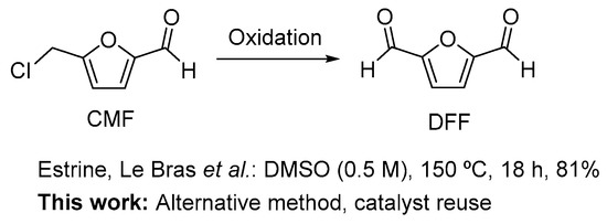 In general, DFF is prepared by the oxidation of HMF [8,11]. The selective oxidation of the hydroxyl group into the aldehyde has been achieved using a variety of different methodologies including homogeneous [8,11,15,16] and heterogeneous [8,11,17,18,19,20,21,22,23,24,25,26,27,28,29,30,31,32,33,34,35,36,37] metal catalysis, a one-step procedure from fructose (DMSO, NaBr (cat.), 150 °C, 50%) [38], using molybdovanadophosphoric heteropolyacids [39,40], using polyaniline-grafted vanadyl acetylacetonate [41], metal free procedures [42,43,44] and enzyme catalysis [45]. The use of CMF as a starting material for the preparation of DFF was previously described in 2014 by Estrine and Le Bras and later used by the Mascal group. However, the use of DMSO as the solvent and oxidant makes this method less attractive (Scheme 1) [38,46]. To that end, we envisioned the possibility of performing such an oxidation without using DMSO (Scheme 1).