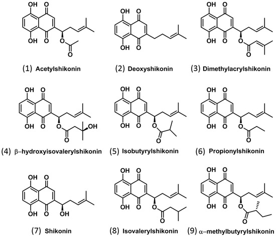 - Chen, X.; Yang, L.; Oppenheim, J.; Howard, M. Cellular pharmacology studies of shikonin derivatives. Phytother. Res. 2002, 16, 199–209. [Google Scholar] [CrossRef] [PubMed]