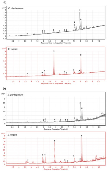 Chromatographic separation obtained from 12 selected field collected samples of Echium plantagineum and E. vulgare. (a) DAD chromatogram of root periderm extracts at wavelength 254 nm and (b) total ion chromatogram of the same extracts. Numbers 1–9 denote shikonins (Table 1).