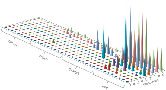 Repeated measures analysis of variance was performed in Statistix 9 (Analytical Software, Talahassee, FL, USA) for controlled condition experiments Data on compound abundance was log-transformed prior to analyses. Standard error of the means was used to show the variability of the abundance. Stepwise logistic regression analysis on the log transformed dataset of 1, 2, 3, 5 and 7 was performed to evaluate the significance of these compounds in peach, orange and red samples. Yellow was excluded from the analysis due to limited complexity and lack of compound abundance. Graphs were generated and edited in Microsoft Excel.