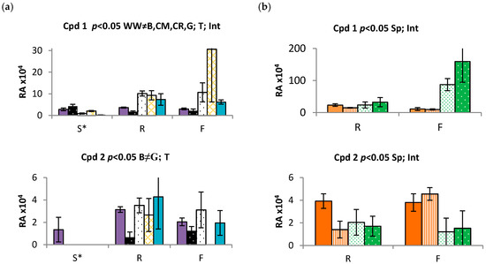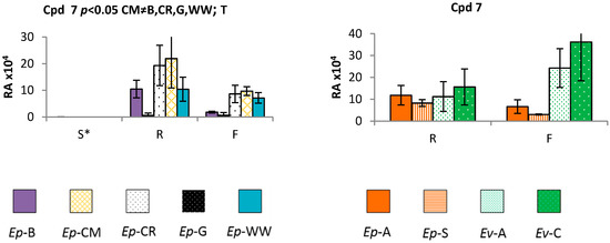 Relative abundance (RA) of 1, 2 and 7 based on the peak area and averaged over replication in Echium plantagineum (Ep) and E. vulgare (Ev) in glasshouse controlled conditions. Error bars represent standard error of the mean (SEM). Key: (a) Ep-B-Bendigo, Ep-CM-Coombah, Ep-CR-Cobar, Ep-G-Grenfell, Ep-WW-Wagga Wagga; (b) Ep-A–Adelong, Ep-S-Silverton, Ev-A–Adaminaby, Ev-C–Cooma. Significant differences (p < 0.05): ≠—between populations, Sp—between species and T—between time points. Int—significant interaction, time × population. S—seedling, R—rosette, F—flowering. Data was log transformed prior to statistical analysis.