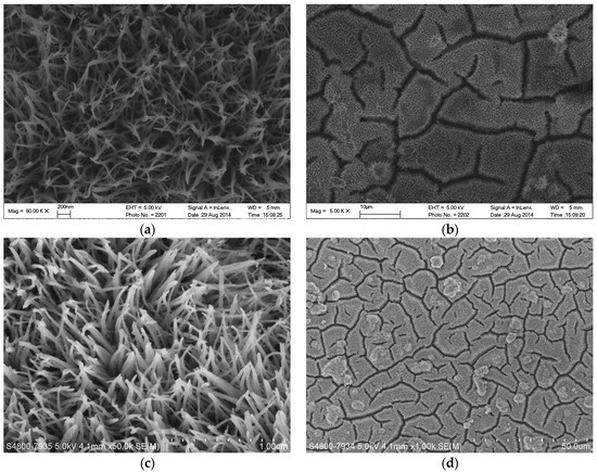 Top-view of the scanning electron microscope (SEM) images of the TiO2 nanowire arrays are shown in Figure 2a,c. Clear, tight, and orderly TiO2 nanowire arrays were observed with very large specific surface areas. The cracks on the base, which are formed by the calcination process, were seen in the low-magnification SEM images (Figure 2b,d). Different thicknesses of titanium plates (i.e., 0.1 mm, 0.2 mm and 0.8 mm) with the same surface size (20 mm × 30 mm) were chosen to investigate the influence of substrate thickness on the formation of TiO2 nanowire arrays. Experimental results demonstrated that this mild preparation method is stable because the TiO2 nanowire arrays can be deposited successfully on all the three Ti substrates of different thicknesses with surface area of 20 mm× 30 mm. Especially, as shown in Figure 2c, an enlarged titanium plate (φ200 mm with a 0.8 mm thickness), with tight and orderly TiO2 nanowire arrays deposited on the surface, was also obtained through this mild preparation method, which confirmed that the method can be applied for the preparation of large-scale materials for industrial design.